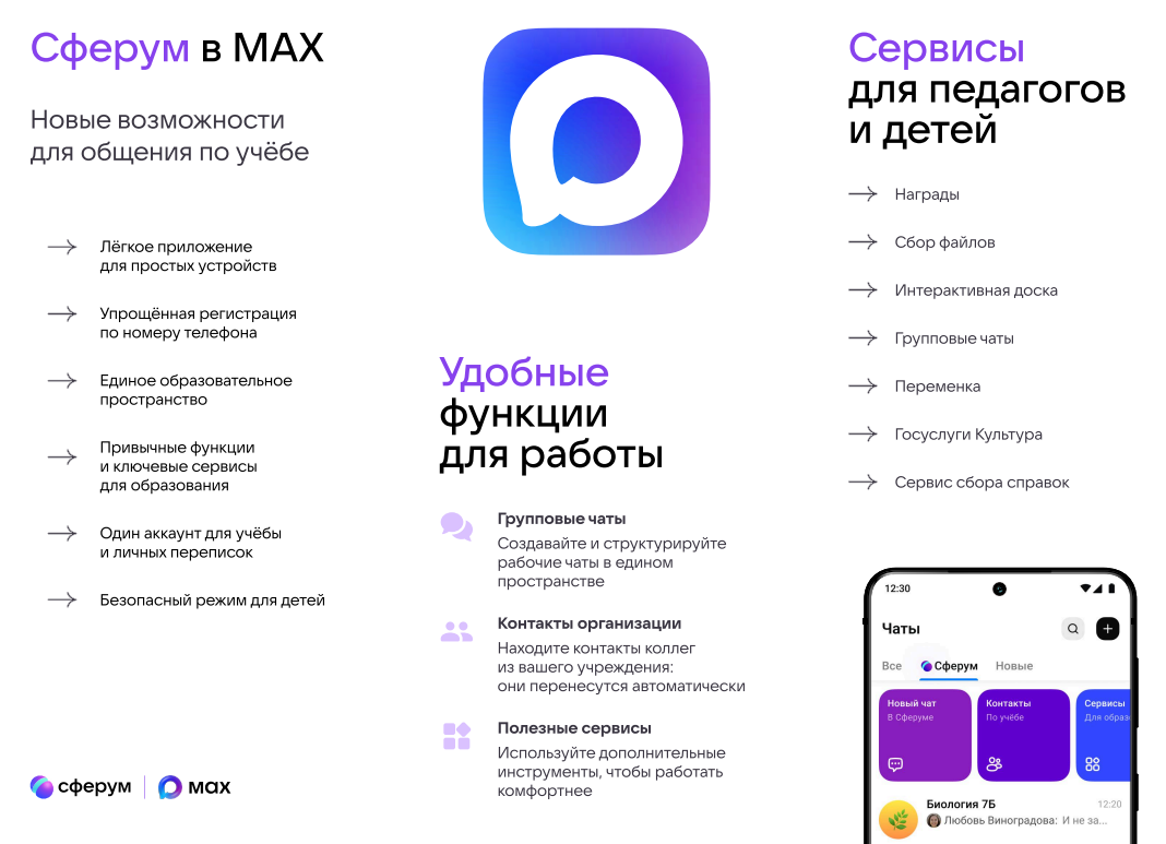 - Безопасность и контроль: Мах интегрируется с образовательной платформой «Сферум», что повышает безопасность коммуникаций и упрощает администрирование.