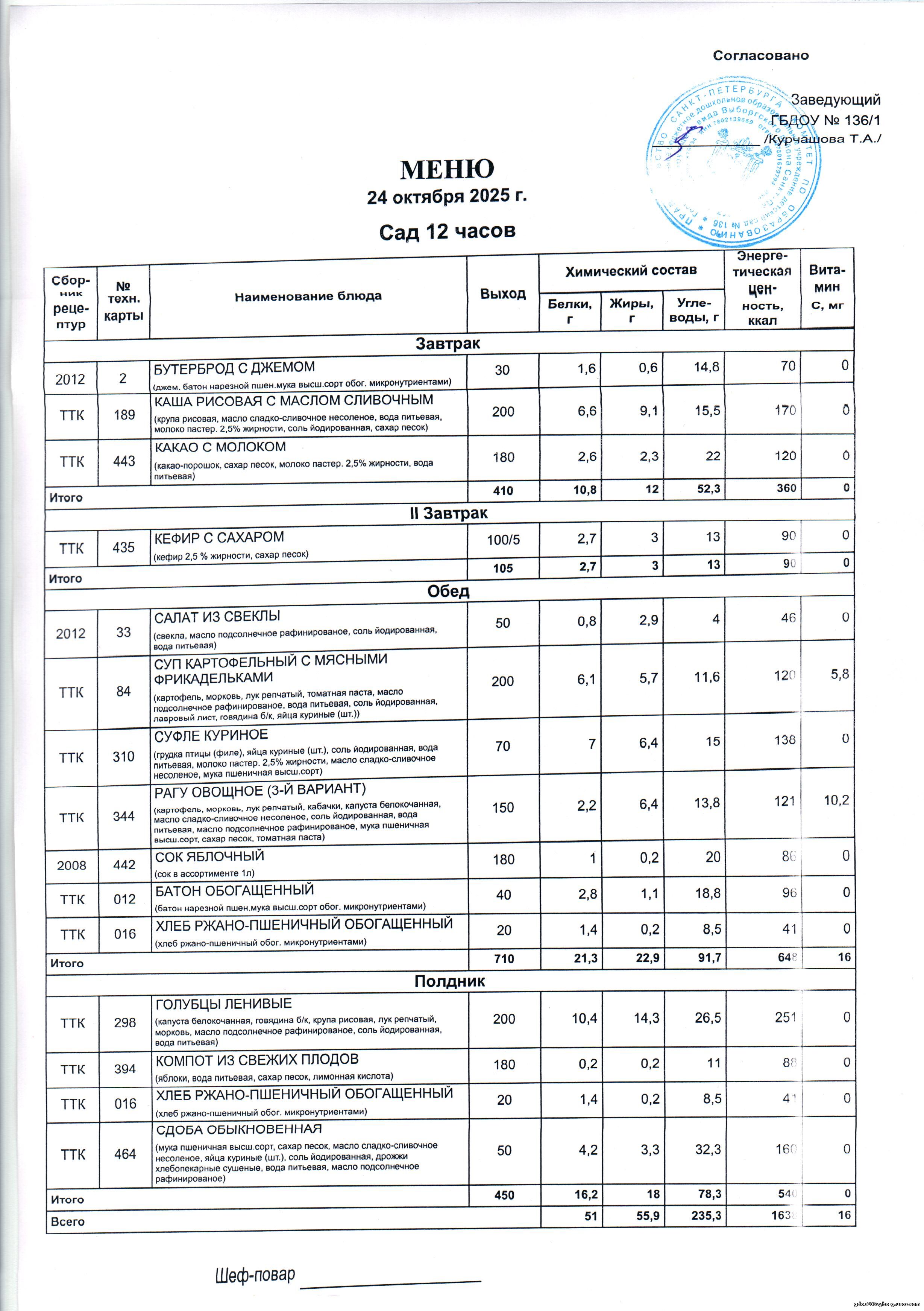 Информация об условиях питания: пищеблок -горячий цех, холодный цех, кладовые. Режим работы пищеблока: ежедневно в рабочие дни с 05.00 до 17.00 Организация питания в детском саду осуществляется: с 01 июня 2021 г. ГБДОУ перешел от собственной формы обеспечения питания к сторонней организации. Контракт на организацию горячего питания заключен с ООО «БАЗА «МАРИЯ»»Питание воспитанников в ГБДОУ детский сад №136 Выборгского района Санкт-Петербурга осуществляется самостоятельно в соответствии с действующими нормами питания, нормативными актами Российской Федерации и Санкт-Петербурга по организации питания детей дошкольного возраста, требованиями законодательства в сфере санитарного благополучия населения СанПиН 2.3/2.4.3590-20 «Санитарно - эпидемиологические требования к организации общественного питания населения», Постановлением Главного государственного санитарного врача Российской Федерации от 28.09.2020 № 28 «Об утверждении санитарных правил СП 2.4.3648-20 «Санитарно-эпидемиологические требования к организациям воспитания и обучения, отдыха и оздоровления детей и молодежи» и Постановлением Главного государственного санитарного врача РФ от 27.10.2020 № 32 «Об утверждении санитарных правил и норм. Дети обеспечиваются 4-х кратным питанием (завтрак, второй завтрак, обед, полдник). Детям, имеющим пищевую аллергию, производится замена блюд на основе соответствующих норм питания и меню. Питание осуществляется в соответствии с Цикличным десятидневным меню для организации питания детей в возрасте от 1,5 до 3 лет и от 3 до 7 лет, посещающих дошкольные образовательные учреждения Санкт- Петербурга, в соответствии с физиологическими нормами потребления продуктов питания», рекомендованным Управлением социального питания Правительства Санкт-Петербурга. Поставку продуктов осуществляет ООО "База Мария".