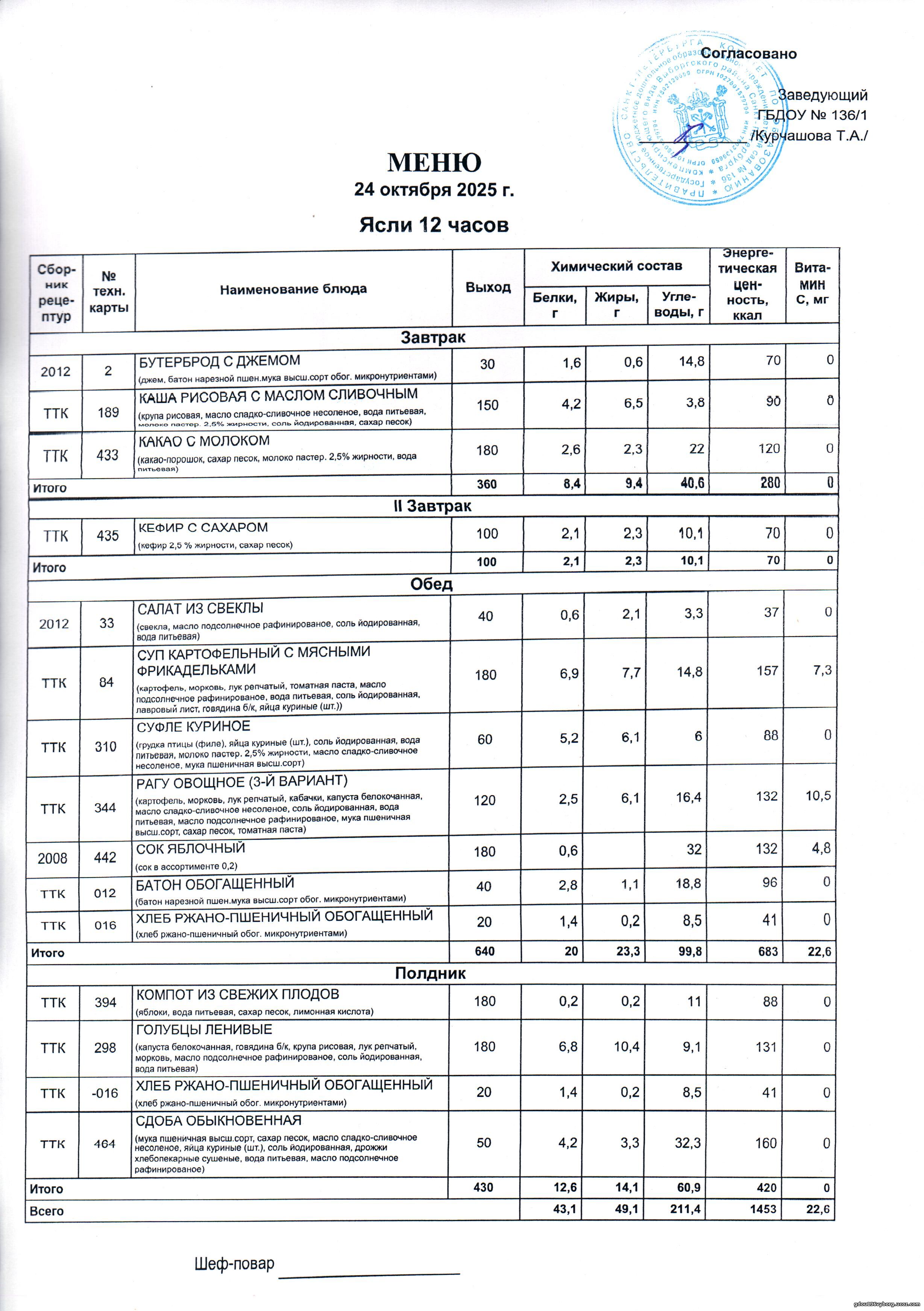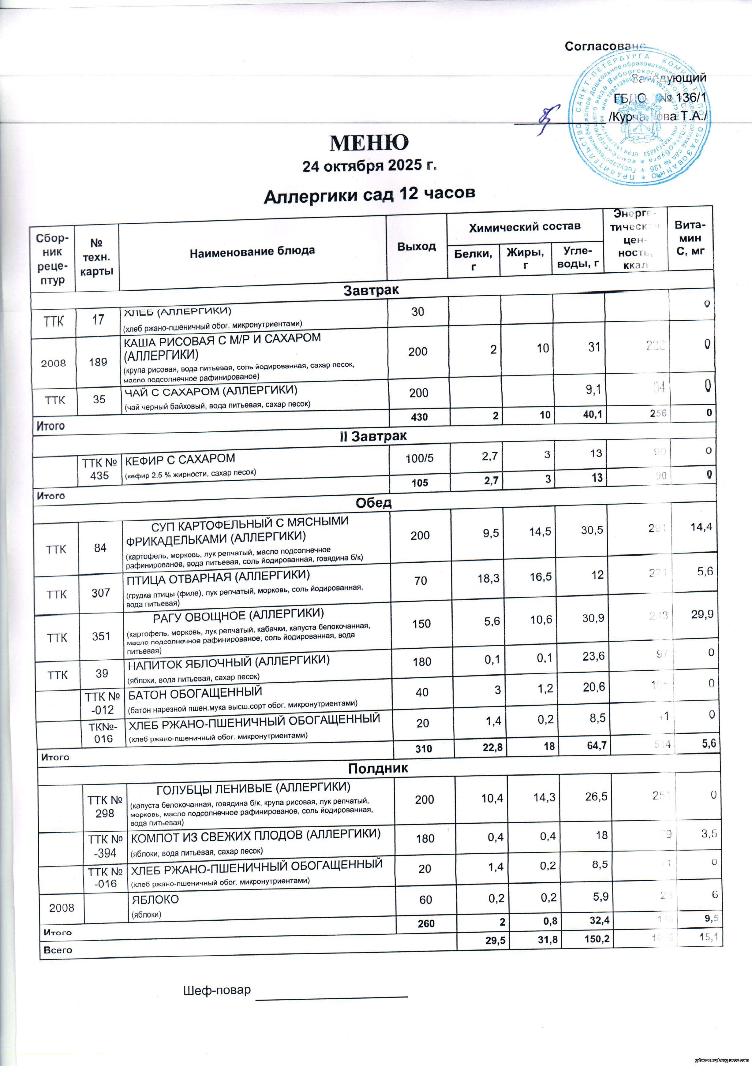 Меню (в том числе информация о наличии диетического меню в образовательной организации) Меню для организации питания детей в возрасте 1,5 до 3 лет (с 12-ти часовым пребыванием) Меню для организации питания детей в возрасте с 3 до 7 лет (с 12-ти часовым пребыванием) Меню для организации питания детей аллергиков в возрасте 1,5 до 3 лет (с 12-ти часовым пребыванием) Меню для организации питания детей аллергиков в возрасте с 3 до 7 лет (с 12-ти часовым пребыванием) Меню на 24.10.2025 |