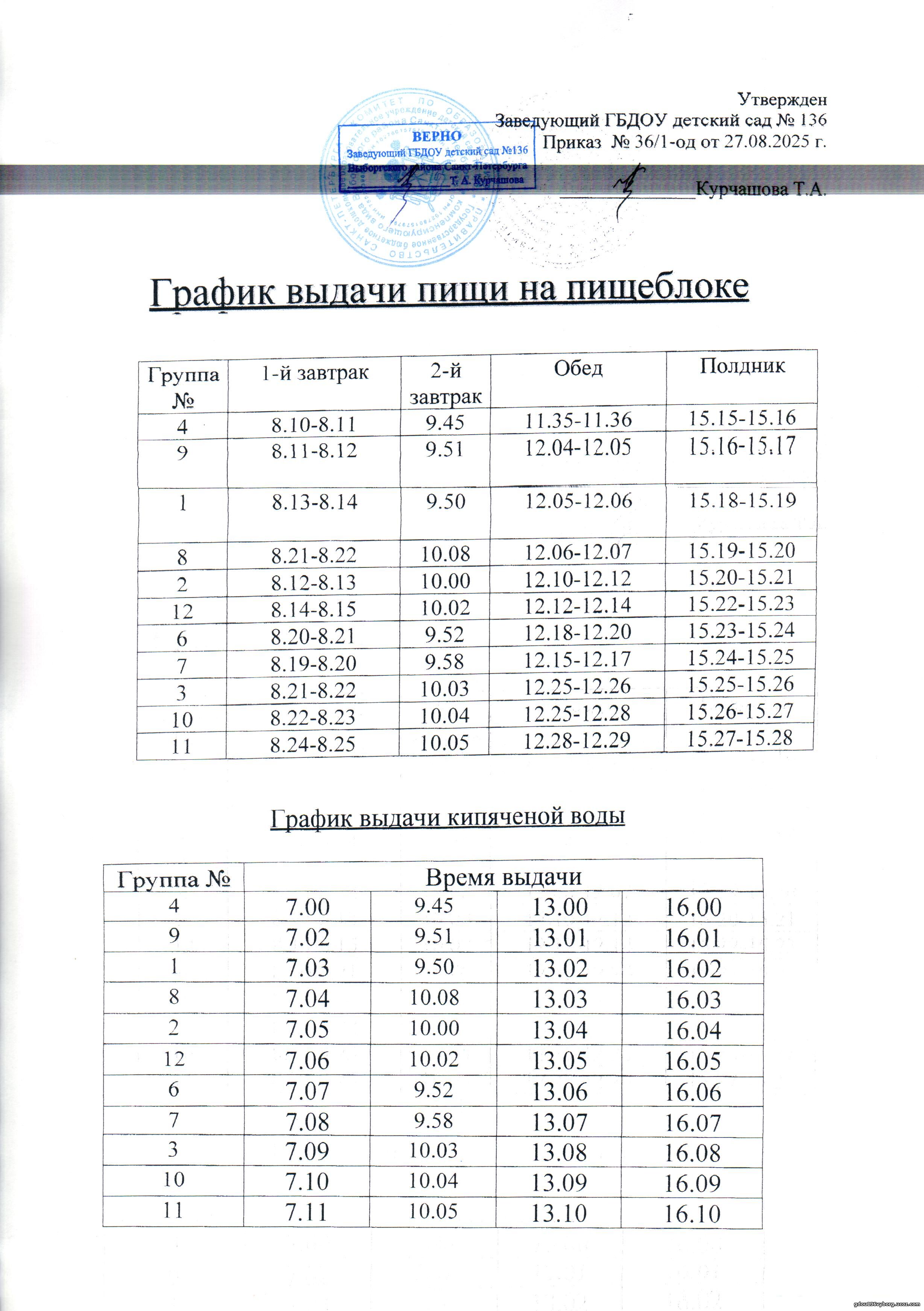Время приема пищи Время приема пищи каждой возрастной группы в соответствии с утвержденными режимами дня. Организация питьевого режима Питьевой режим детей в ГБДОУ детский сад № 136 компенсирующего вида Выборгского района Санкт-Петербурга организован с использованием кипяченой воды. Температура питьевой воды – 18-20 С. Вода даётся детям в стаканах. При этом чистые стаканы ставятся вверх дном в специально отведенном месте на специально промаркированный поднос, а использованные стаканы ставятся на отдельный поднос. Мытье стаканов осуществляется организованно, в моечных столовой посуды. В летний период на время прогулки питьевая вода выносится помощниками воспитателя на улицу в соответствующей ёмкости (графин с крышкой), разливается воспитателем в одноразовые стаканчики по просьбе детей. Смена питьевой воды производится каждые через 3 часа. График выдачи пищи на пищеблоке и график выдачи кипяченой воды |