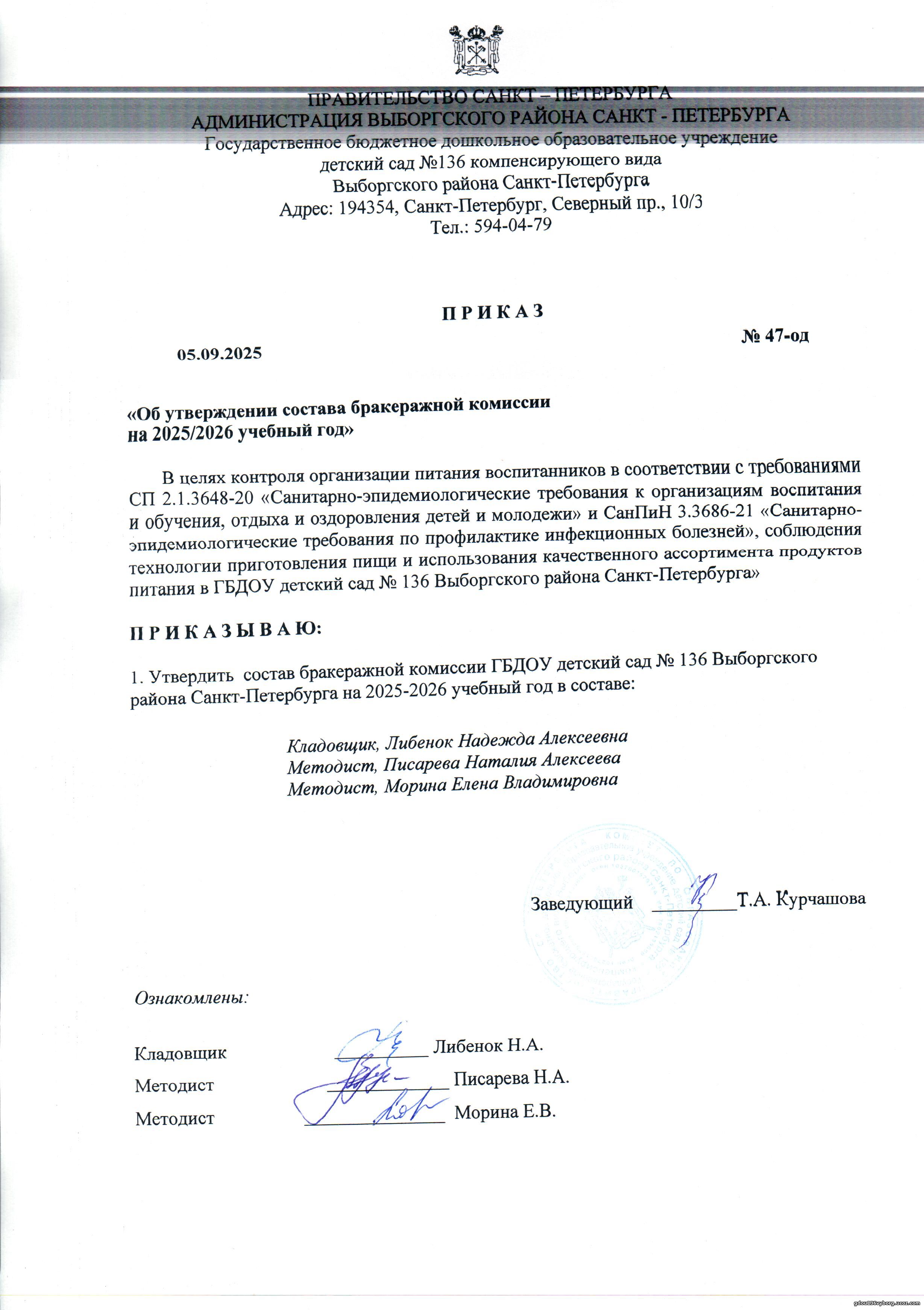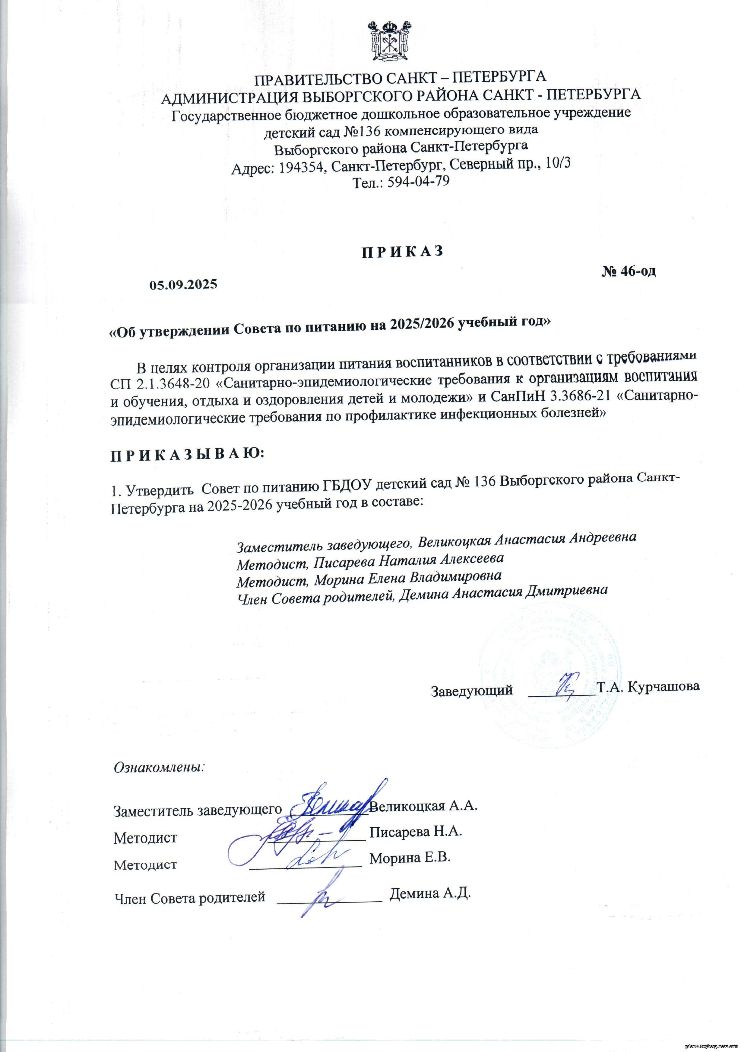 | Ответственный за организацию питания в образовательной организации - заместитель заведующего Великоцкая Анастасия Андреевна тел. (812) 594-05-08 Приказ о назначении ответственного |